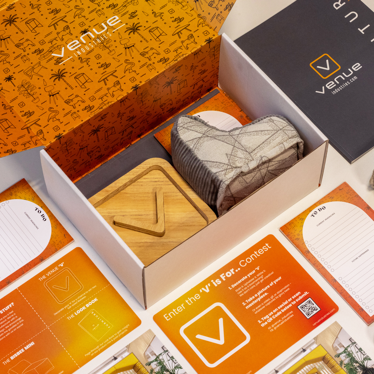 The Venue Industries ‘V’ Is For.. Box Campaign is a direct mail campaign targeting commercial furniture dealers and A&D firms.