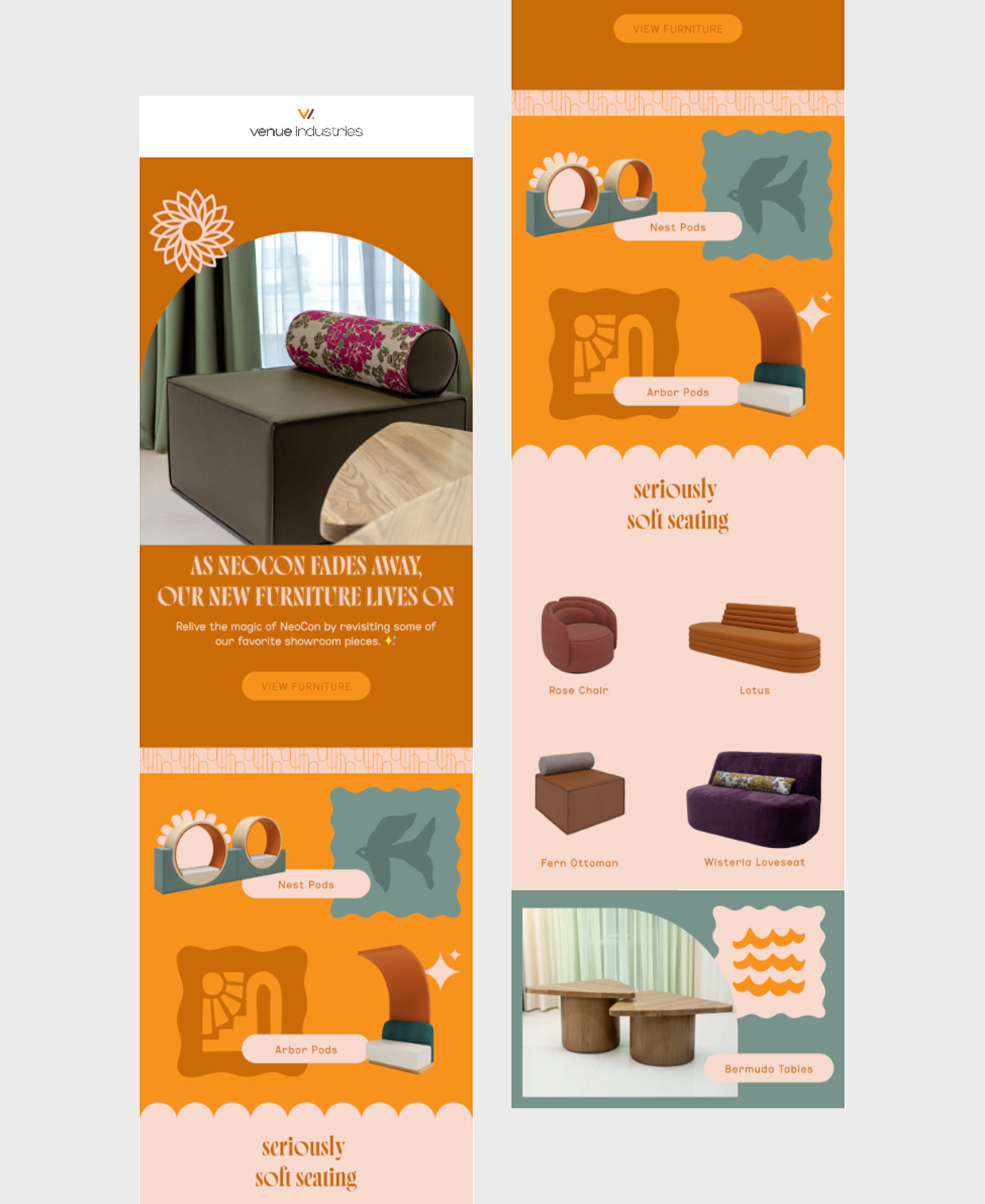 A follow-up email design I created for after NeoCon. The email showcases all of the commercial furniture that was released for debut at the convention.