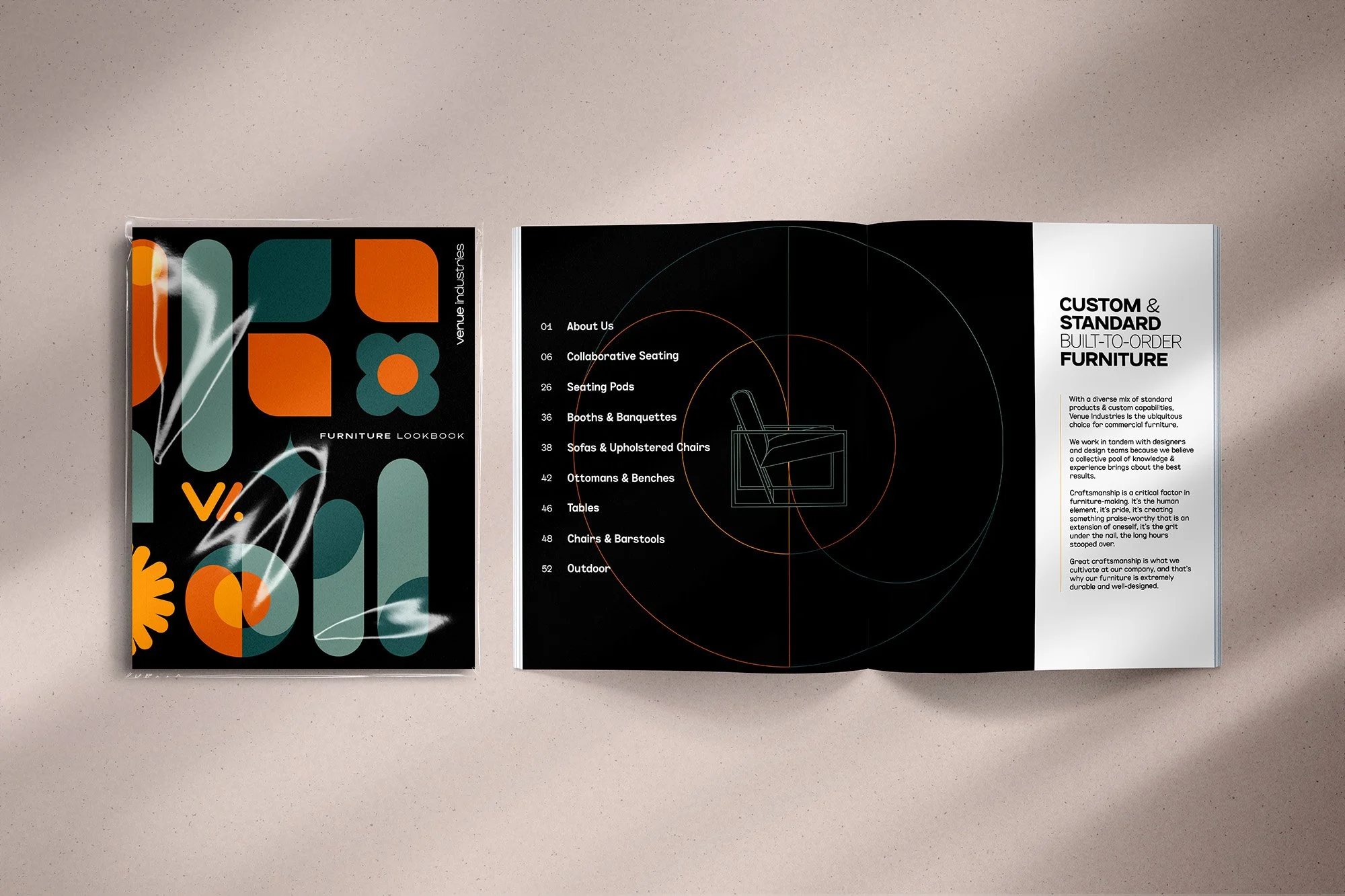 I designed a 64-page lookbook showcasing product imagery and commercial furniture installation photography. I took inspiration from Bauhaus design and the modular nature of the company’s furniture products to design the cover graphic.