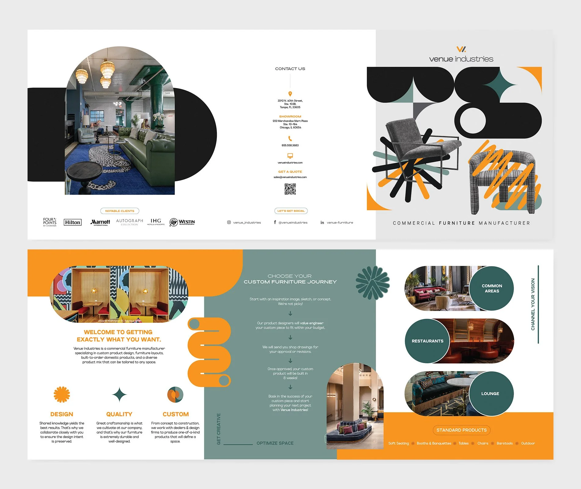 Utilizing the Bauhaus design aspects, I designed this trifold brochure for to showcase product imagery, unique selling points, services, industry expertise and explain the custom design journey.