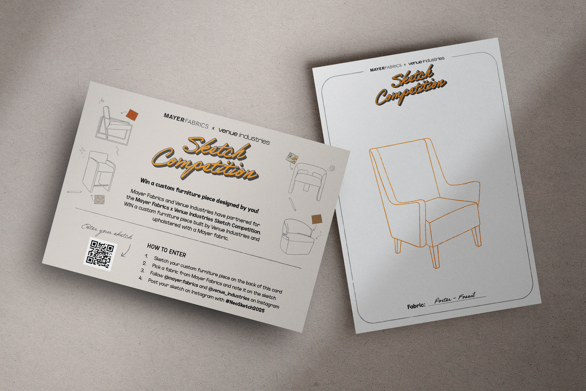 I helped create a brand activation for NeoCon, which is one of the largest annual gatherings for the commercial architecture & design community. The goal of the Mayer Fabrics x Venue Industries Sketch Competition was to drive traffic to our showroom in the Merchandise Mart during NeoCon, while increasing engagement via user-generated content on social media. Working with Mayer Fabrics, a commercial textile manufacturer, we orchestrated a competition where NeoCon attendees could sketch a custom furniture design and pick a fabric for a chance to have their design built for them.